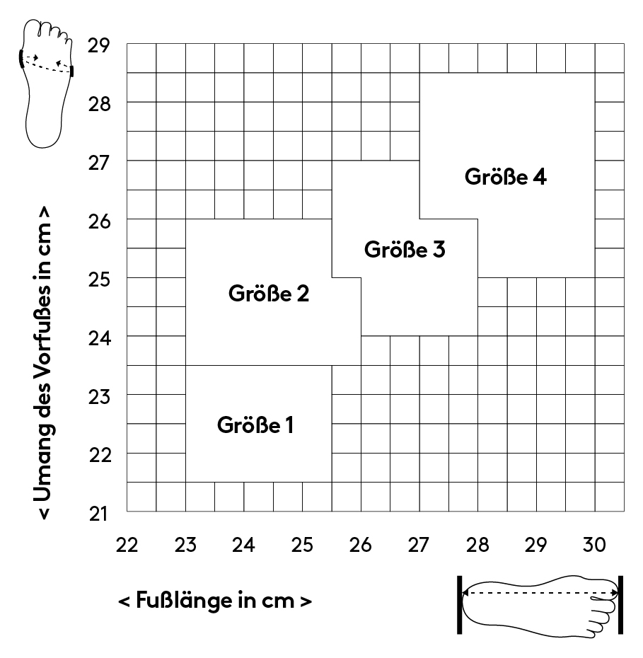 Es ist wichtig, sowohl die Länge des Fußes als auch den Umfang des Vorderfußes zu messen. Beim Messen des Fußes sollte das Gewicht auf dem Fuß liegen. Sehen Sie sich hier die Auswahltabelle an.